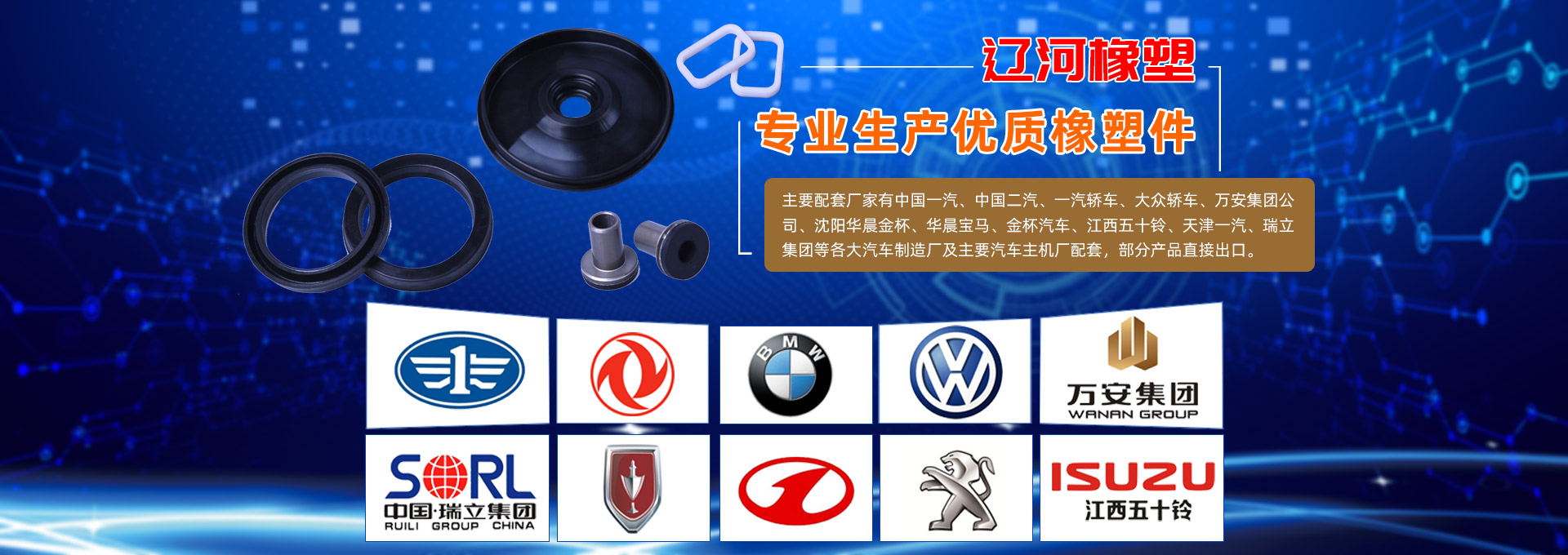遼河集團(tuán)主要生產(chǎn)各類(lèi)汽車(chē)三角窗密封條、O形圈、油封、皮膜、皮碗、減震系列等各類(lèi)橡塑密封件和汽車(chē)用橡膠制品,公司銷(xiāo)售網(wǎng)點(diǎn)遍布全國(guó)各地,目前已經(jīng)為全國(guó)各大汽車(chē)制造廠及主要汽車(chē)主機(jī)廠配套各種橡膠制品。